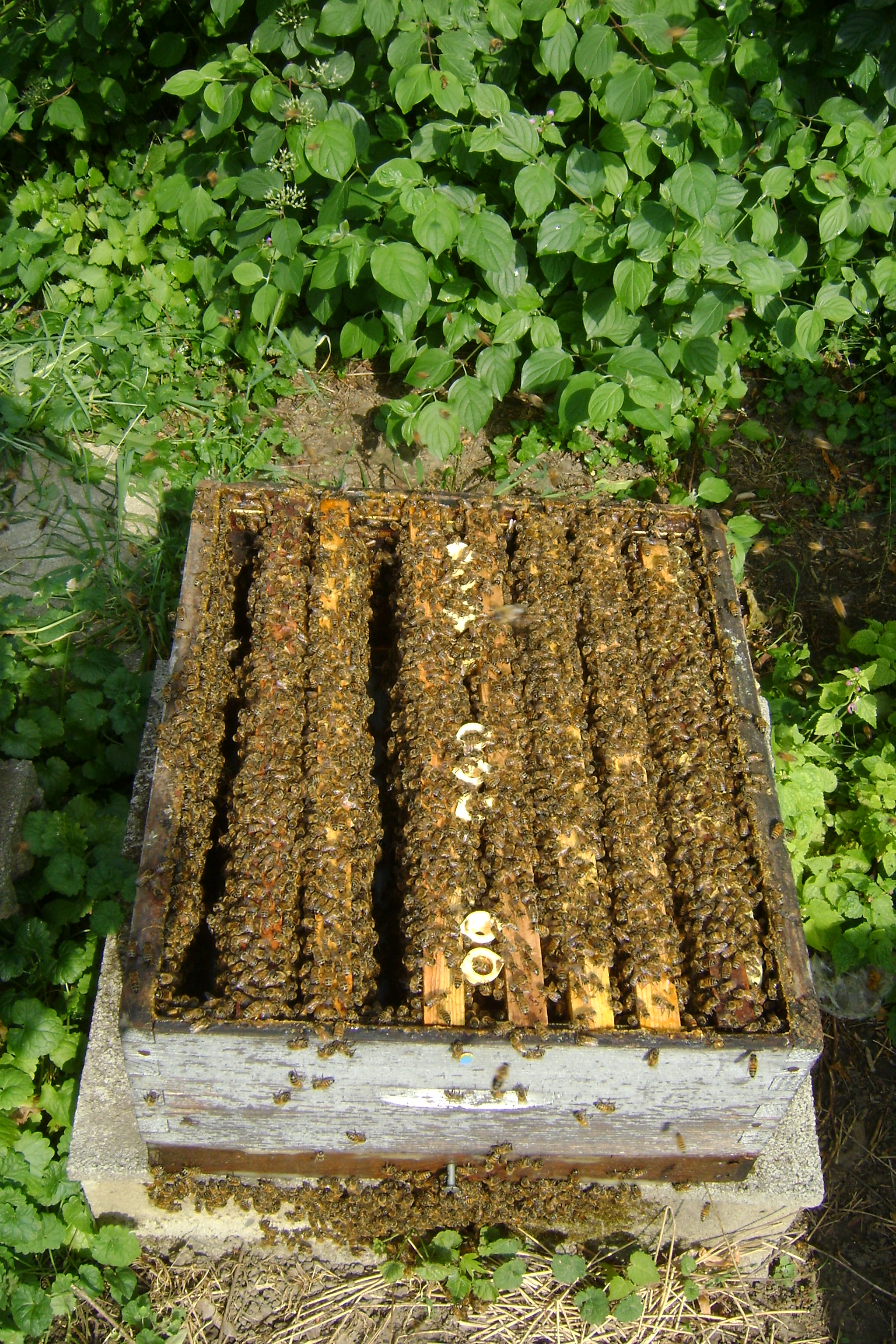 Tous les essaims artificiels réalisés à cette occasion, les essaims naturels récoltés ici et là, seront conduits avec force nourrissement pour développer ces nouvelles colonies. Un essaim naturel construit bien, autant en profiter. « Pour que ça cire faut que ça miele » selon le dicton. Il faut du sucre et des protéines, on apportera du sirop pour accélérer le processus de construction. Le principe, est le suivant, le sirop collecté par les butineuses est totalement réparti dans toute la colonie chaque abeille consomme selon ses besoins et régurgite le reste concentré dans une cellule, mais si la place vient à manquer l’abeille conserve ce nectar dans son jabot puis le digère et ce surcroit de nourriture déclenche le fonctionnement des glandes cirières.