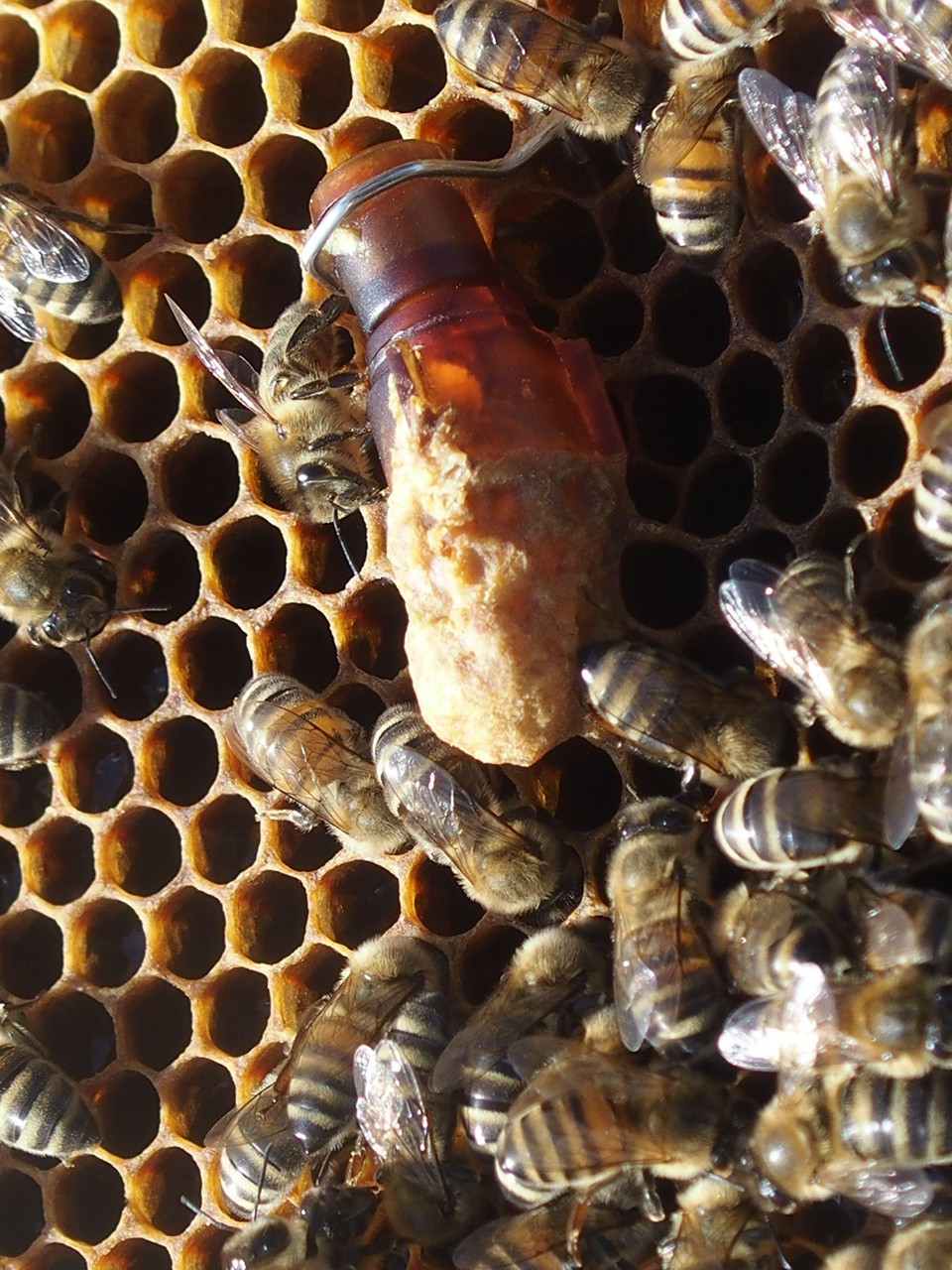 Au jour J, inspecter les cadres et détruire toutes les CR naturelles, prélever des larves d’un jour, les poser dans une cupule et incruster celles-ci dans le couvain la cupule bien au ras du rayon pour que les abeilles orphelines trouvent de suite la larve et viennent rapidement la nourrir. En mettre 2 face à face.